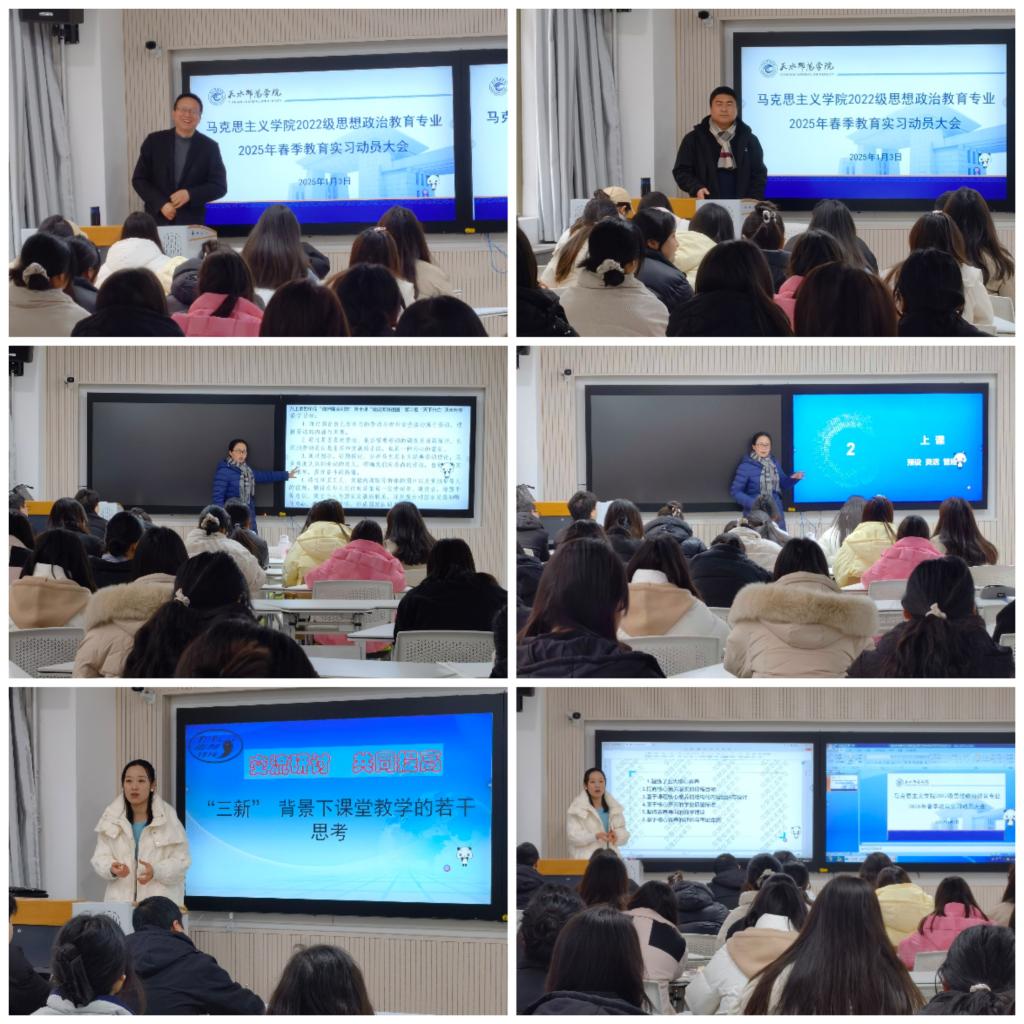 明升MS88体育登录副院长余明远教授作了题为“讲台人生,鉴知胜行——教育实习中不可忽视的那些事”的安全教育,聚焦教育实习流程中的每一个细节,结合典型事例,强调教育实习在本科师范生培养中的重要性及其防范化解教育实习中安全隐患的注意事项。天水市第一中学思政课教师李玲娟与天水市逸夫实验中学思政课教师王斌丽分别对学生的教学展示进行指导,李玲娟还作了题为“‘三新’背景下课堂教学的若干思考”的专题讲座,并以“美丽中国”课题作了示范教学。思想政治教育系主任吴亚辉博士作了“实习、考研和论文选题:三者如何兼顾”的专题讲座,引导学生正确处理教育实习、考研和论文选题之间的关系,以期最大化发挥教育实习的综合价值。2021级思想政治教育专业学生代表郭嘉毅、王旭、张致和、朱文惠和任惠婕基于自身的亲身经历,分享了教育实习的心得体会,总结了教育实习的经验教训。