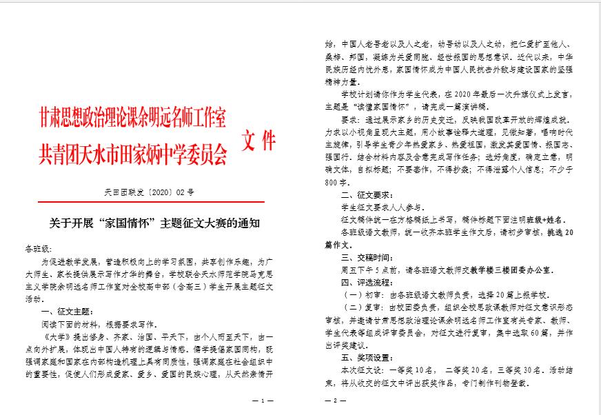 名师工作室与共青团天水市田家炳中学委员会 联合举办“家国情怀”征文大赛