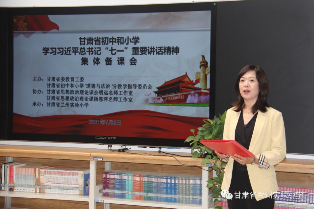 为学习贯彻习近平总书记在庆祝中国共产党成立100周年庆祝大会上的重要讲话精神,推进党史学习教育深入开展,讲好新时代思政课,充分发挥思政课教师主力军作用,按照甘肃省委教育工委的统一部署,2021年9月8日,甘肃省初中和小学学习习近平总书记“七一”重要讲话精神集体备课会在甘肃省兰州实验小学召开。全省初中和小学约7000名思政课教师通过陇政钉平台相聚线上,共同参与集体备课会。在主会场,甘肃省兰州实验小学提前做好会议各项准备,从会场布置、网络调试、人员安排等都做了周密安排。当天,全体思政课教师全程参加了本次集体备课活动,并做了深入研讨。