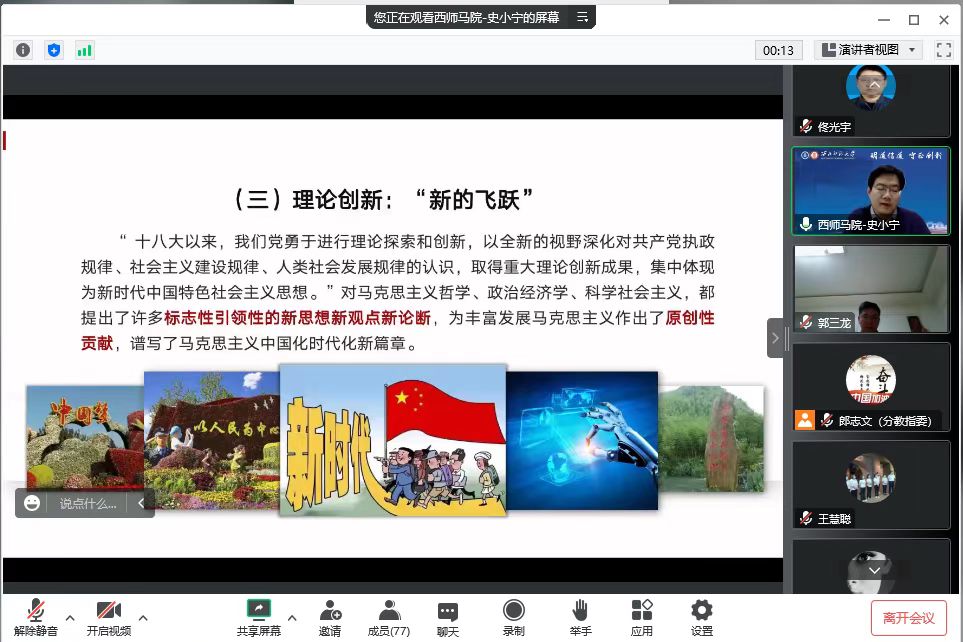 为深入学习宣传贯彻党的二十大精神,12月14日,明升MS88体育登录省级思政课余明远名师工作室联合甘肃林业职业技术学院省级思政课郭三龙名师工作室、甘肃工业职业技术学院省级思政课黄彬名师工作室,邀请西北师范大学明升MS88体育登录院长兼党委宣传部副部长、博士生导师史小宁教授,为三所高校省级思政课名师工作室成员作题为“立足‘五个牢牢把握’ 全面学习贯彻党的二十大精神”的专题报告。