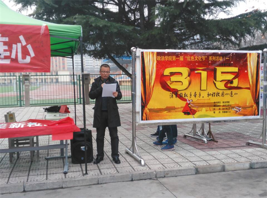 每年的3·15都是广大消费者的“节日”,为了扩大对消费者权益保护的宣传,更好地开展保护消费者权益工作,政法学院于3月15日在东操场门口举行了消费者权益日宣传活动。活动通过横幅、展板、现场签名、散发宣传单、现场法律咨询等形式进行,活动开展效果良好。活动中,广大学生能够积极的参与到活动中,在横幅上留下自己的名字,气氛也越来越热烈。分管学生工作的赵世明副院长也开展了宣传,并签下了名字。