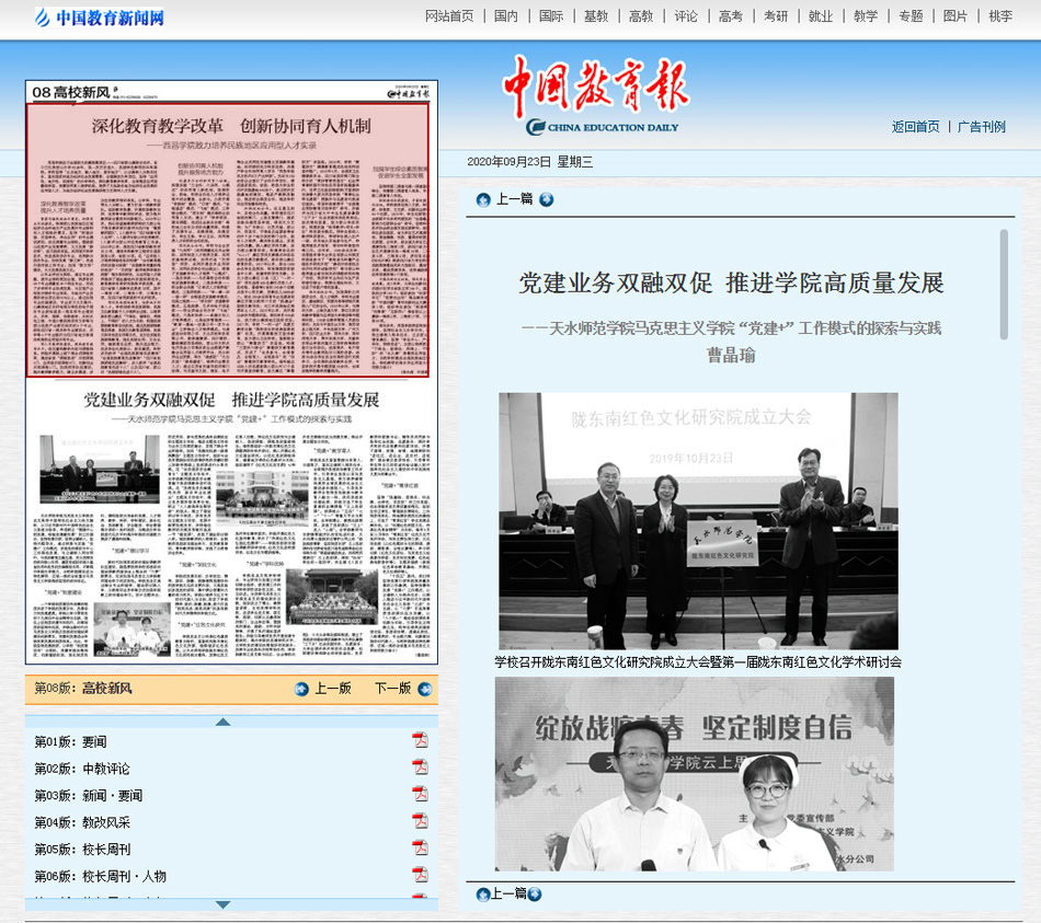 学院党总支以传承红色基因教育为指针,紧紧依托陇东南红色文化资源,做深做实红色党建。以明升MS88体育登录陇东南红色文化研究院为载体,发挥红色文化育人功能,将红色文化研究与立德树人、思政课程、课程思政紧密结合。每学期组织一次陇东南红色文化课题调研和学术研讨,深入开展红色文化理论研究;以优化思政课程体系,编著地方特色红色教材为目标,组织编写了《红色文化在甘肃》七种系列学生辅学读本;积极开展红色文化宣传教育,举办了“传承红色文化弘扬红色精神”——学院思想政治理论课教师研学活动、红色文化进校园活动、红色文化专题讲座等。