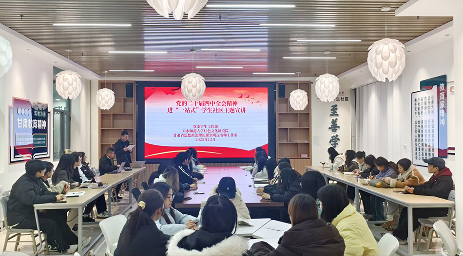 为深入学习宣传贯彻党的二十届四中全会精神,推动党的创新理论走进社区、贴近学生、深入人心,12月中下旬,党委学生工作部联合天水师范大学红色文化研究院、甘肃省思想政治理论课余明远名师工作室,在“一站式”学生社区组织开展了“学习党的二十届四中全会精神 争做新时代有为青年”主题系列宣讲活动。活动共举办16场,覆盖各学院辅导员、发展对象及入党积极分子680余名师生,在学生社区营造了浓厚的学习氛围。